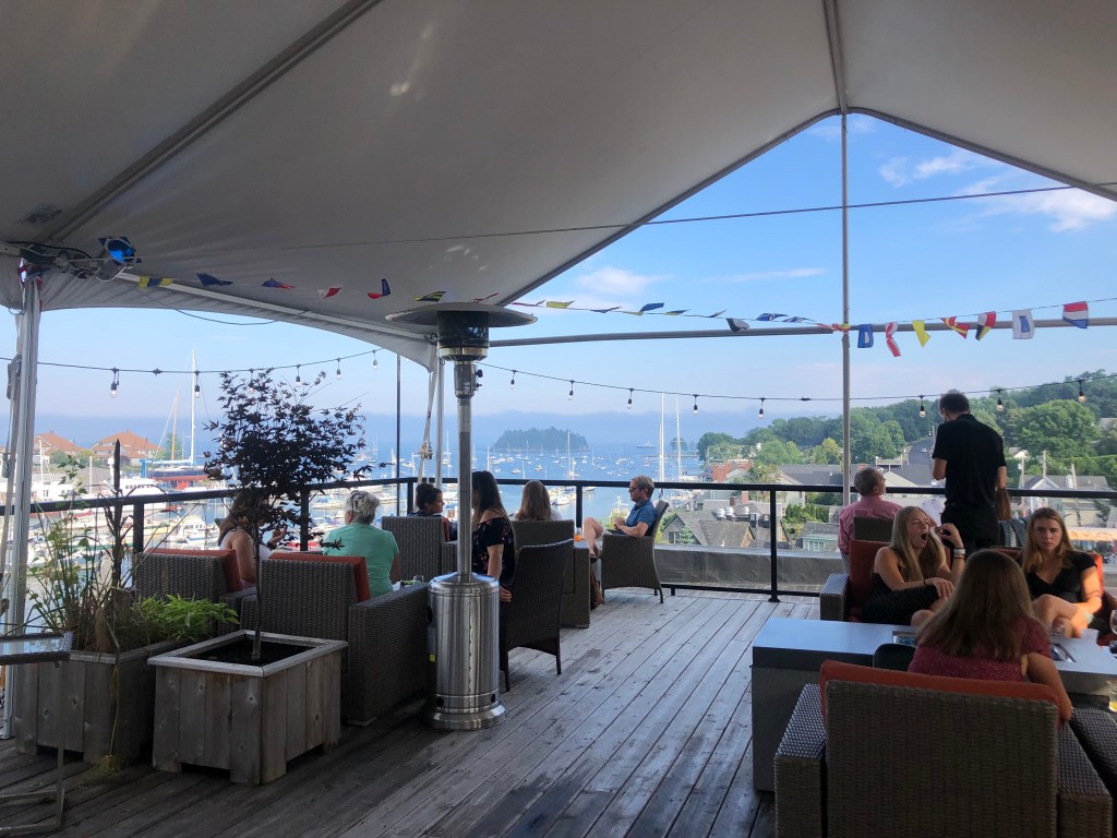 Once back in Camden, we headed to the rooftop of 16 Bay View, a luxury Maine boutique hotel, with a rooftop bar overlooking the harbor. All of the lounging seats along the outside were full, but we enjoyed our hightop in the middle of the roof. We sipped our drinks while chatting and watching the boats sail back into the harbor for the evening. We began looking for dinner options to soon learn that most places to eat in Camden were closed on Mondays. I’m not totally sure, but I think this scheduling was due to COVID restrictions and needing time for restaurants to restock and sanitize. The bar was one of the places that was open for dining, but their options were limited. After a round or two, we decided to check out a nearby restaurant that looked to be open, but quickly learned that they were not.