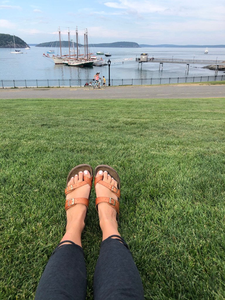One of the things I remember most about my previous visit to Bar Harbor was the most delicious blueberry muffin and blueberry pie. Since we hadn’t had lunch, and it was still a bit early for dinner, we went on a search for a treat to satisfy my craving. Disappointedly, the place that previously had the blueberry muffin had closed for the day, but we did find a little bakery, The Pink Pastry Shop, that sold slices of pie. We got a sliced to share and found a patch of grass overlooking the harbor to indulge in our hiking adventure reward.
