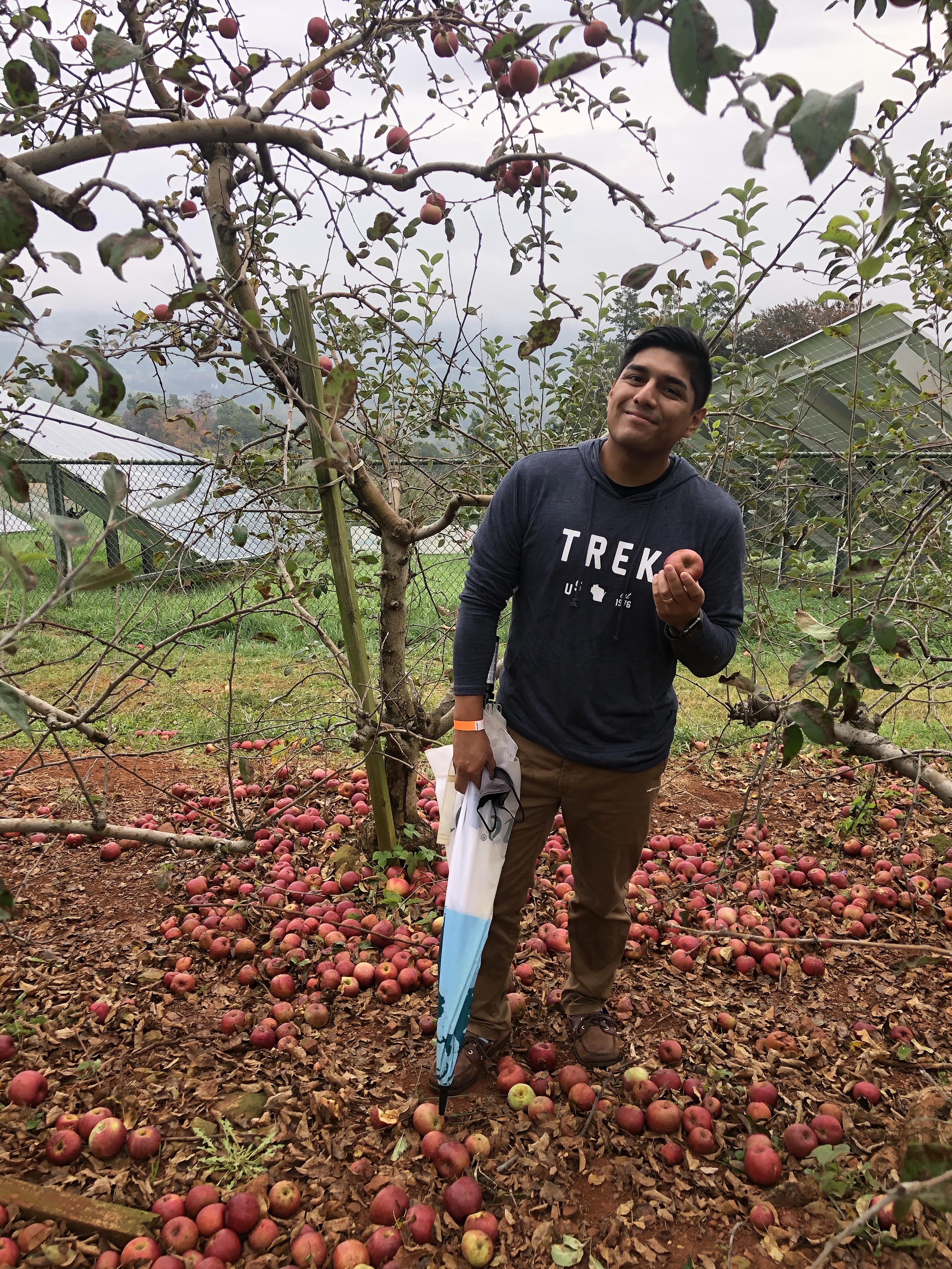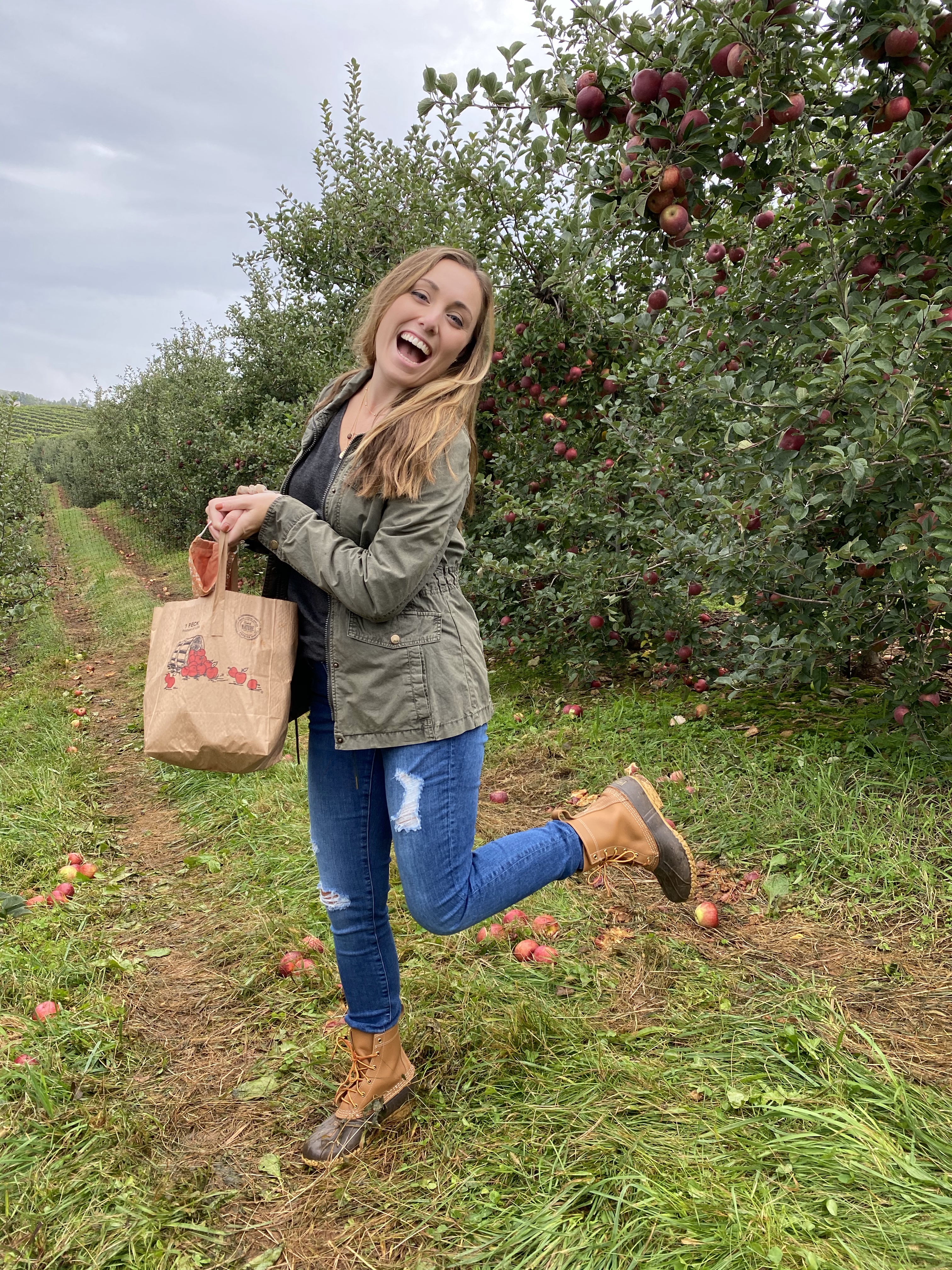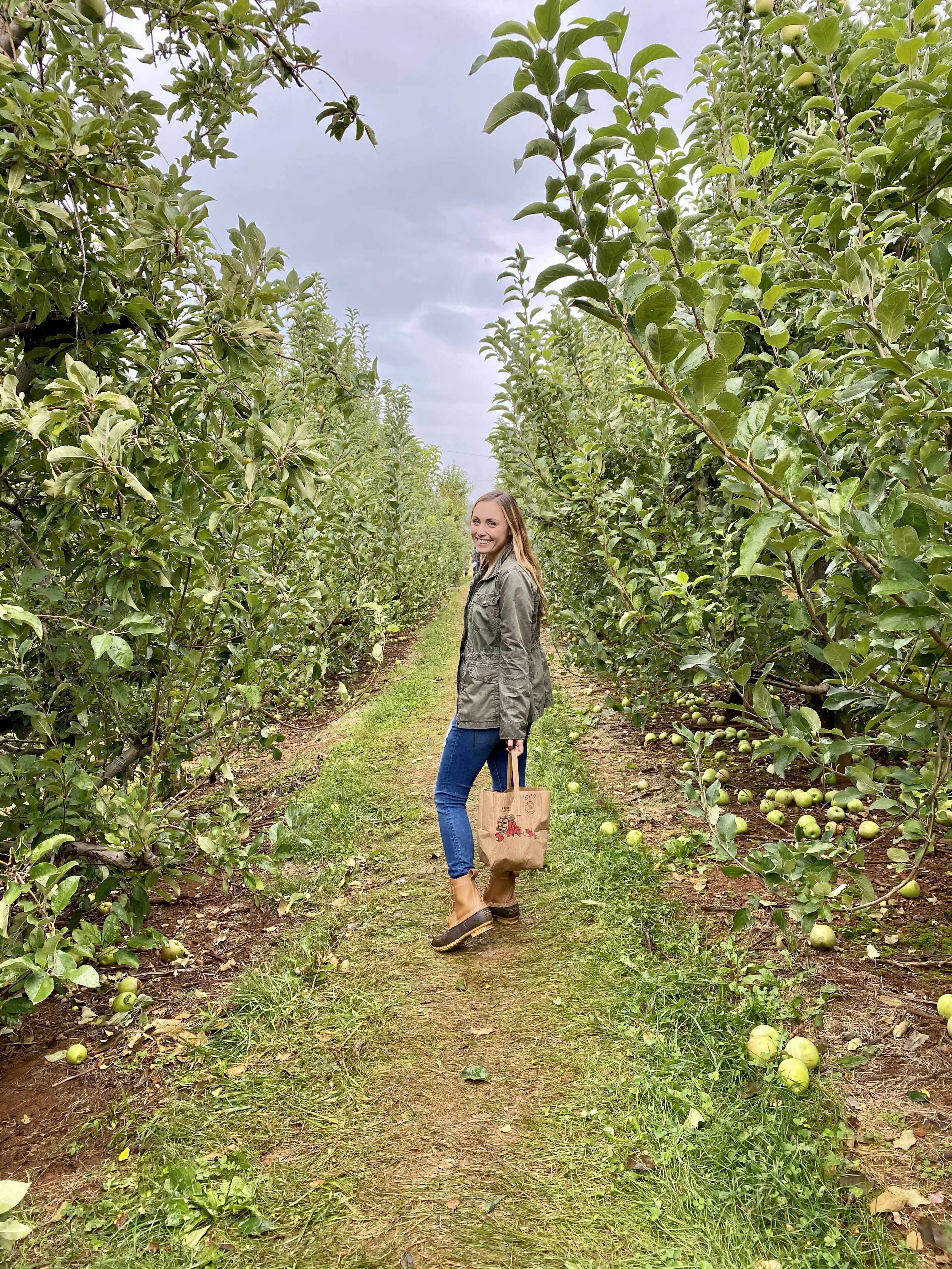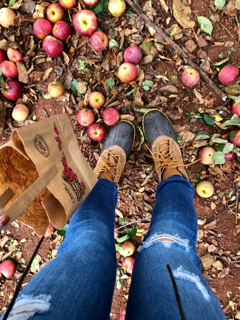 The weather has varied with each year. We’ve gone on days where it was too warm to feel like fall, days that were incredibly windy and cold, and days where it rained the entire time. This year, we had the perfect temperature – in the upper 60’s – but it was overcast and misty the entire day. It honestly didn’t bother me as much as I thought it would. A bit of a chill in the air and cloudy skies just felt like fall. It did make walking through the muddy orchard challenging at times, but I was happy to be putting my Bean Boots to work!