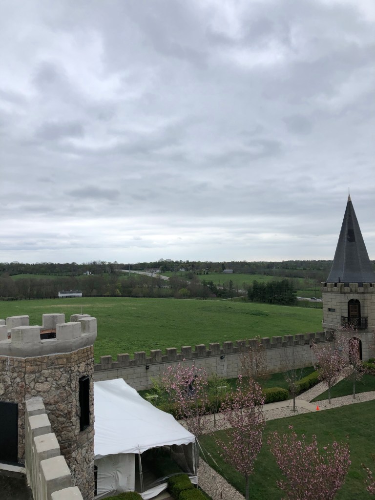 I stumbled across this venue when looking up restaurants in the Lexington area, not thinking much of it since I figured Jody wouldn’t have much of an interest in dining in a castle. However, I was proved wrong when we first drove past The Kentucky Castle headed towards Woodford Reserve. We called the next day to see if they had any available for brunch on our last morning in Kentucky, figuring they were booked, but were excited to learn that they did, in fact, have an open reservation available. When we arrived for our reservation, we had a bit of time to wander the grounds and rooftop before our seating. It was such a gorgeous venue, with stunning views of the rolling hills and thoroughbred horse farms of Kentucky.