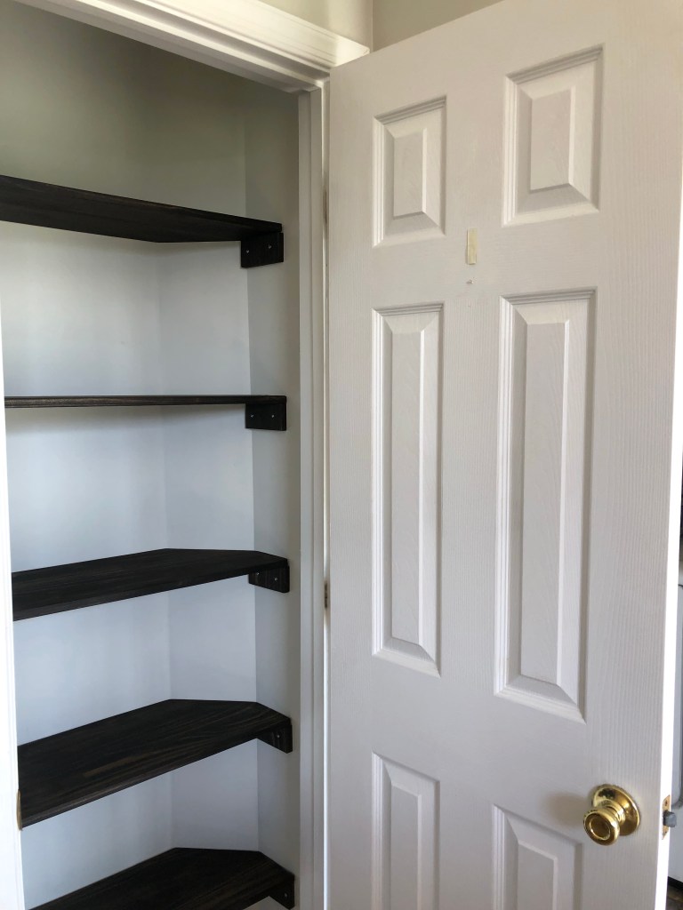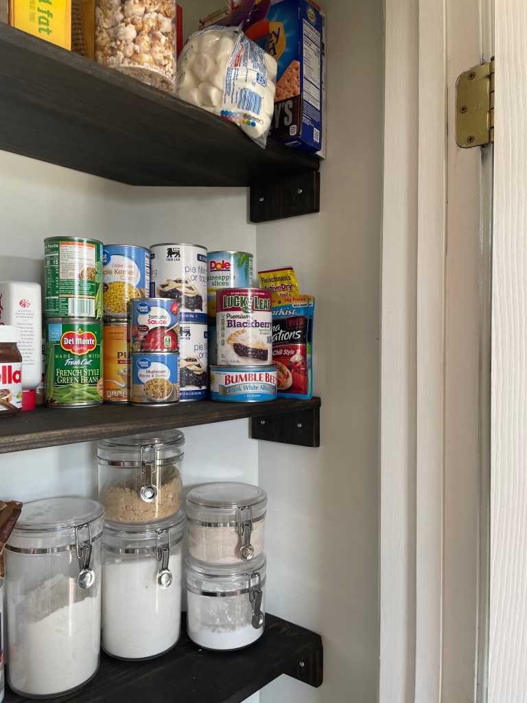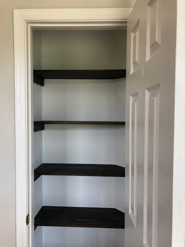 My mom has pretty remarkable craftsman skills, so I enlisted her help for this project. After purchasing the wood from Lowe’s, we cut it according to our measurements, using the extra pieces as the side braces to hold up the shelves. After staining, we first installed the braces on the side walls of the pantry, before laying the wooden shelves on top. I chose to keep the shelves in relatively the same spot, give or take a few inches, since that system seemed to work for us before.