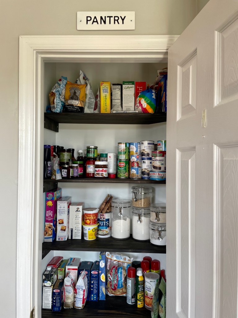I still plan to get some different containers and baskets to keep this space well-organized, plus decide how to utilize the space on the back of the pantry door. We have several inches of space between the door and the start of shelving, so I’m considering attaching some racks to hold spices or other smaller containers. If you have a great use for this space, please share with me in the comments! Overall, I’m thrilled with how it turned out. It was a budget friend project (considering we bought and made 10 shelves!), and has made a huge impact on keeping this space organized. A simple upgrade makes our kitchen feel more welcoming and personalized. It feels great to have checked off this top priority project!